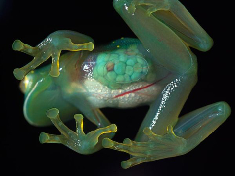 Lớp da trong suốt của con ếch thủy tinh (glass frog) dài 2,5cm này cho chúng ta thấy rõ cả nội tạng bên trong cơ thể chúng. Phổ biến ở Venezuela, ếch thủy tinh đẻ trứng trên các bụi và cành cây nhô ra bên bờ suối để giúp các con nòng nòng nở ra từ trứng sẽ rơi thẳng xuống dòng nước. Ảnh của Heidi và Hans-Jurgen Koch.
