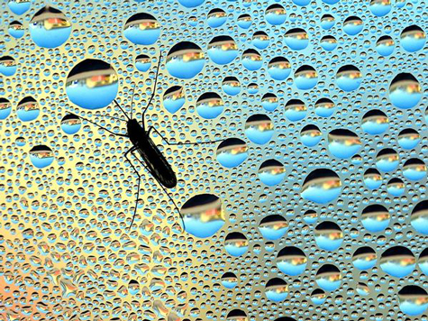 Một con muỗi đang đậu phía trong một tấm kính cửa sổ đầy những giọt nước bên ngoài ở Kotka (Phần lan). Mỗi giọt nước phản chiếu da trời mùa xuân và màu sơn của các ngôi nhà gần đó. Ảnh của Juhani Kosonen.