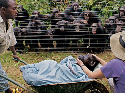 Hàng tá bè bạn đang than khóc cho con tinh tinh cái hơn 40 tuổi Dorothy, chết do đột quị tim mạch và đang được đưa đi chôn cất tại Trung tâm cứu trợ Tinh tinh Sanaga-Yong. Ảnh của Monica Szczupider.