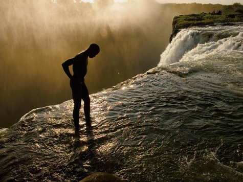 Nước đang đổ từ trên ngọn thác Victoria cao 108 mét, một vận động viên bơi lội đứng ở đỉnh thác, rìa một vực nước ngầm có độ sâu khoảng 2 mét trong khu đá của lòng sông Zambezi. Khi nước sông xuống thấp, người ta có thể tiếp cận được vực nước ngầm này. Ảnh của Annie Griffiths Belt.